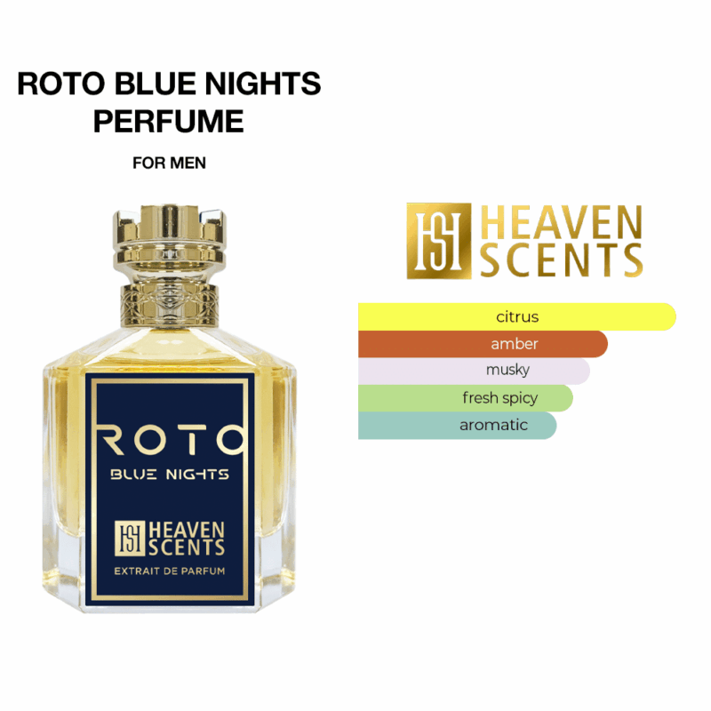 روتو بلو نايتس من هيفن سنتس هو عطر حمضي عطرى للرجال والنساء، حيث يجمع بين الجريب فروت والزنجبيل في قلبه، ويترك أثرًا دافئًا مع أمبروكسان والمسك.