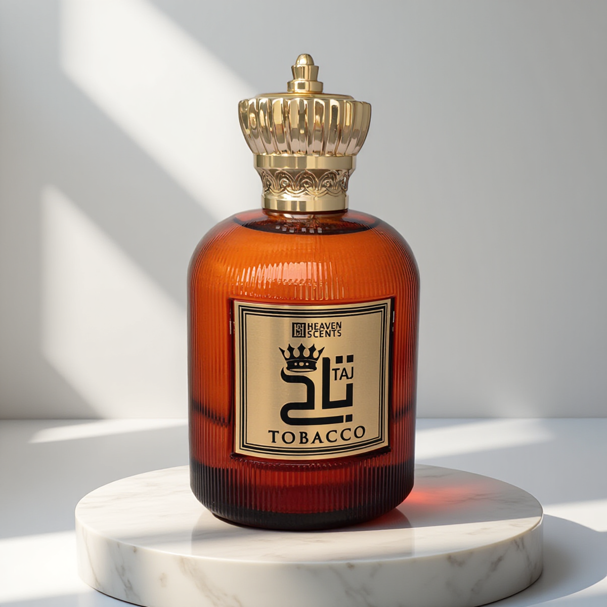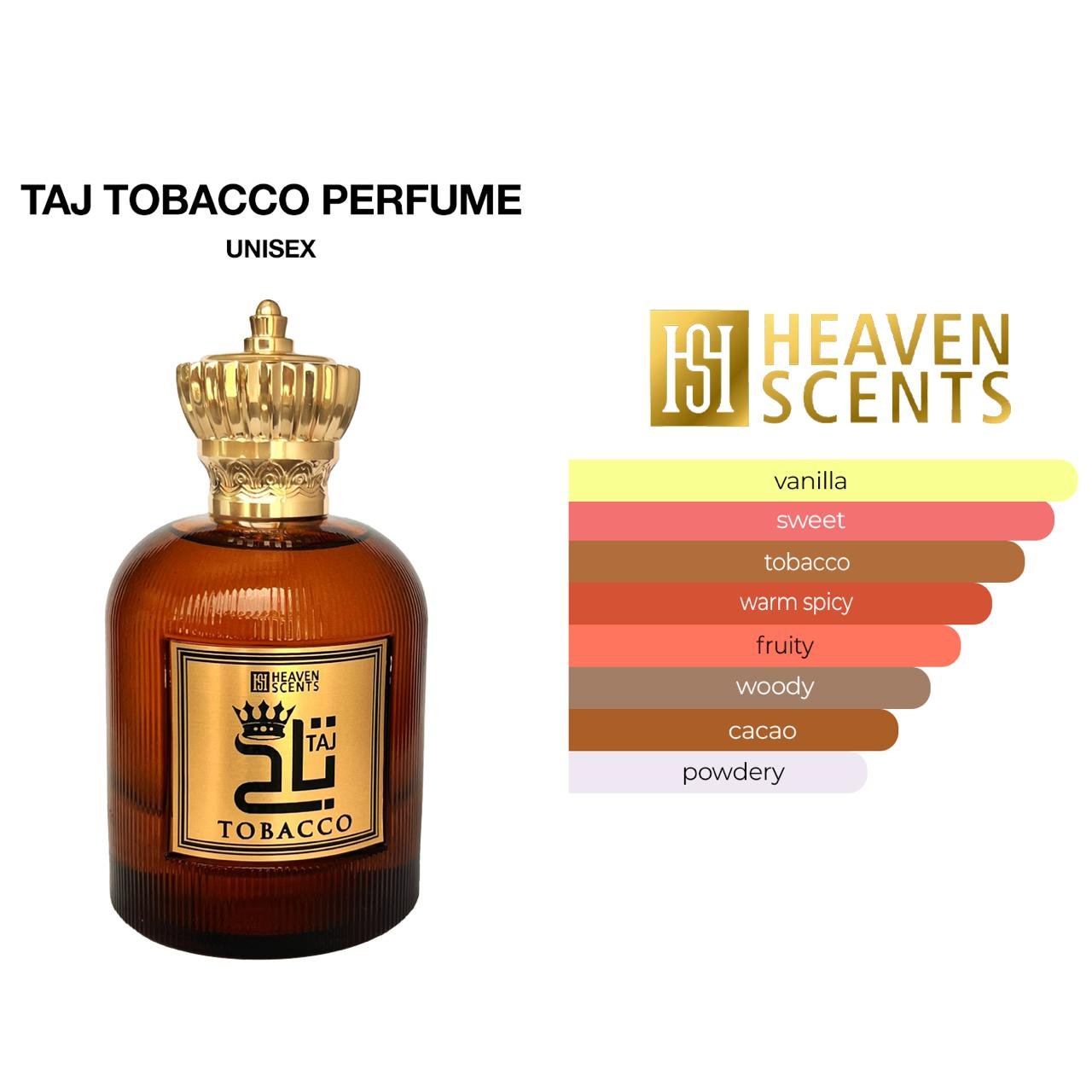 عطر تاج توباكو من هيفن سنتس هو مزيج أنيق يجمع بين نغمات التبغ والتوابل الغنية، مستوحى من عطر توباكو فانيل لتوم فورد. حيث يبدأ بأوراق التبغ الحادة والنوتات الحارة، ثم ينتقل إلى قلب ناعم من الفانيليا والكاكاو مع لمسات من زهرة التبغ وحبوب التونكا. وتختتم القاعدة بنوتات الفواكه المجففة والخشب التي تدوم لساعات طويلة. وبالتالي فهو يناسب العطر الرجال والنساء، ويضفي شعورًا بالرقي في جميع المناسبات.