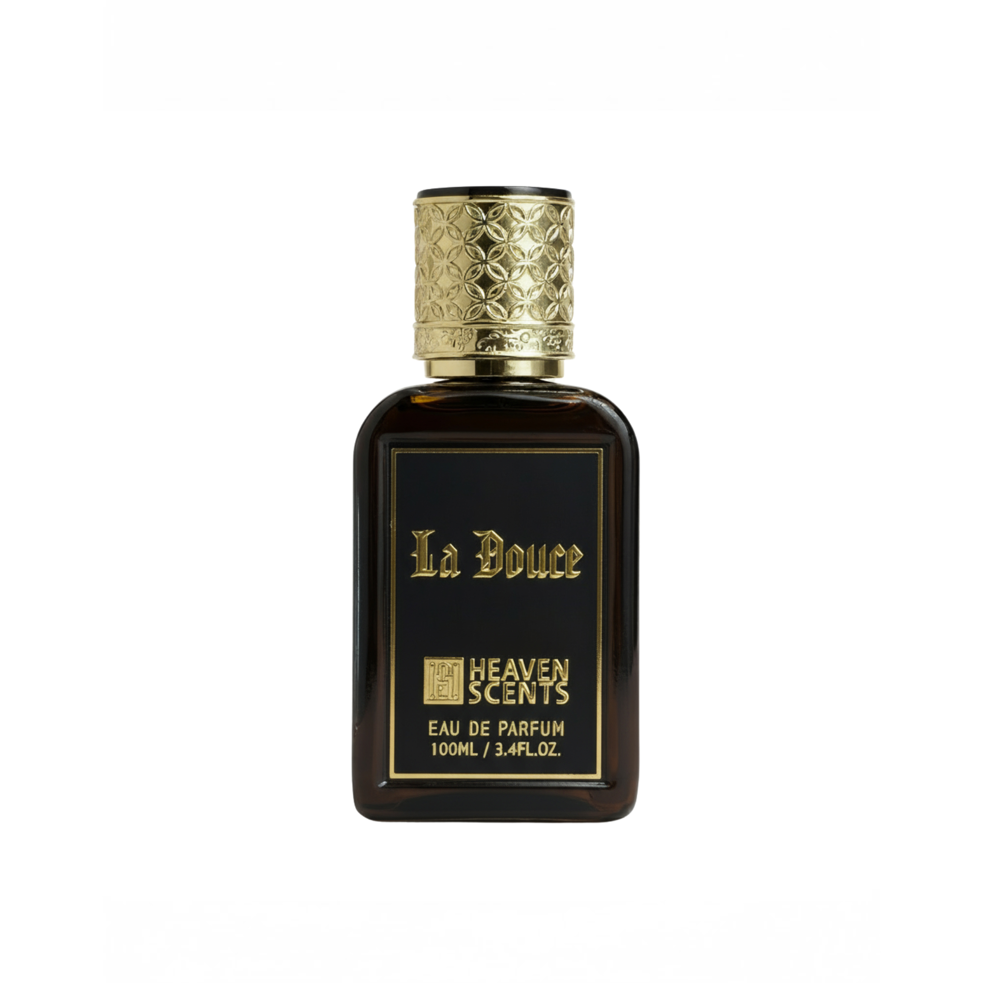 عطر كلاسيكي راقٍ في زجاجة داكنة بغطاء ذهبي منقوش.