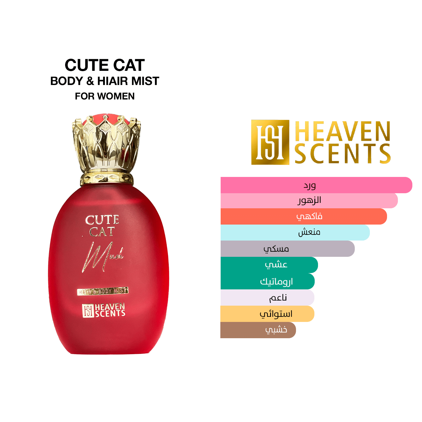 معطر الجسم والشعر كيوت كات مع المسك من هيفن سنتس هو عطر منعش بنفحات زهرية، مصمم للرجال والنساء على حد سواء، يمنح شعورًا بالنقاء والانتعاش، مع مزيج مميز من الفواكه والزهور.