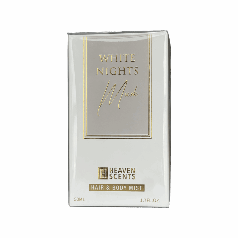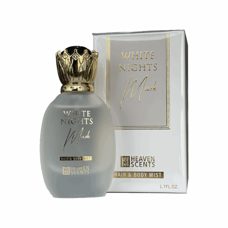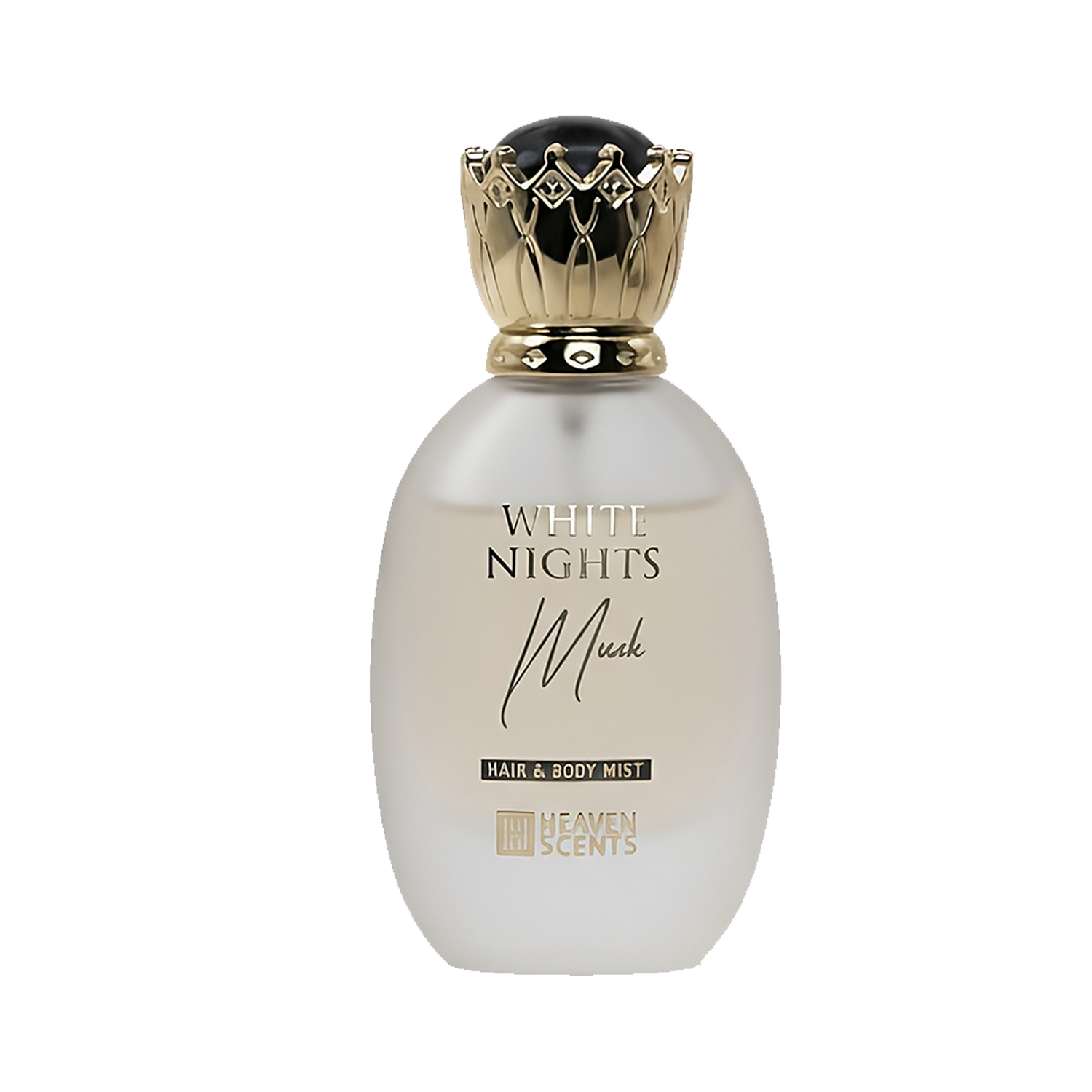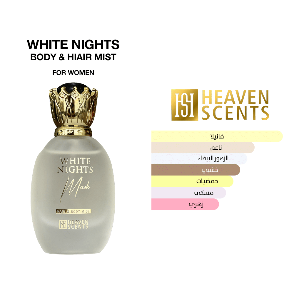 معطر الجسم والشعر وايت نايتس مع المسك من هيفن سنتس هو عطر زهري كهرماني منعش يناسب الجنسين، يتميز بمزيج من ماء جوز الهند، الياسمين، والفانيليا.